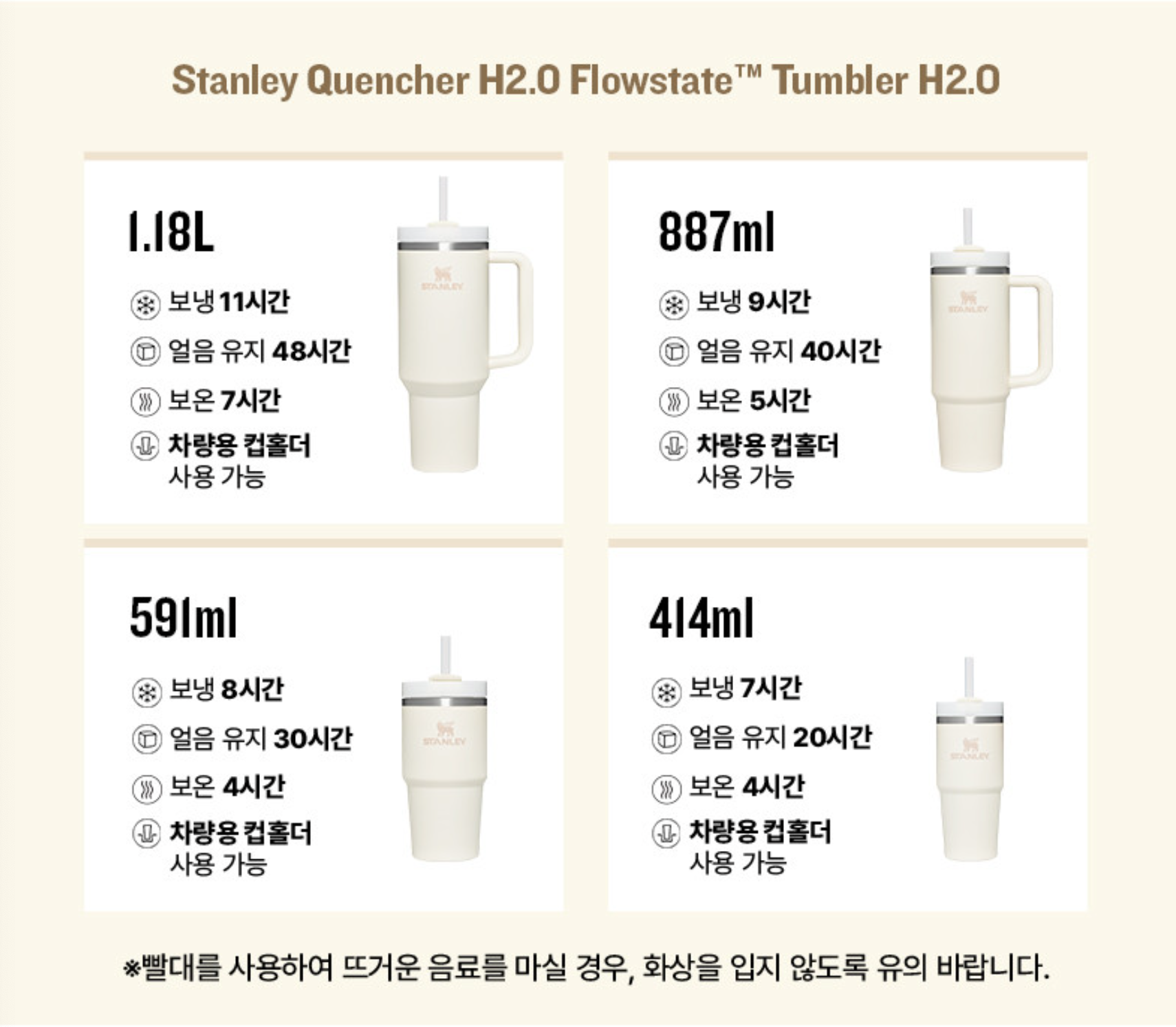 네 제품 모두 차량용 컵홀더 사용가능하고 크기에 따라 보온 보냉 얼음유지 시간이 조금씩 달라짐.